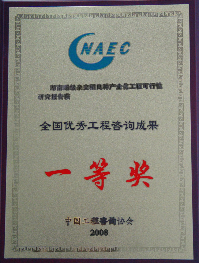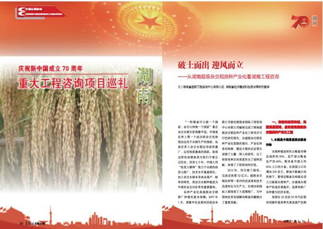 省咨詢公司完成的《湖南超級(jí)雜交稻良種產(chǎn)業(yè)化工程可行性研究報(bào)告》作為湖南唯一申報(bào)的工程咨詢成果,參展了中國(guó)工程咨詢協(xié)會(huì)“慶祝新中國(guó)成立70周年重大工程咨詢項(xiàng)目巡禮”,在《中國(guó)工程咨詢》雜志上刊登展示。公司工程咨詢成果獲此殊榮,體現(xiàn)了公司咨詢成果的品質(zhì)和質(zhì)量達(dá)到了一流水平,得到了國(guó)家和湖南省工程咨詢行業(yè)的高度關(guān)注和廣泛認(rèn)可。
