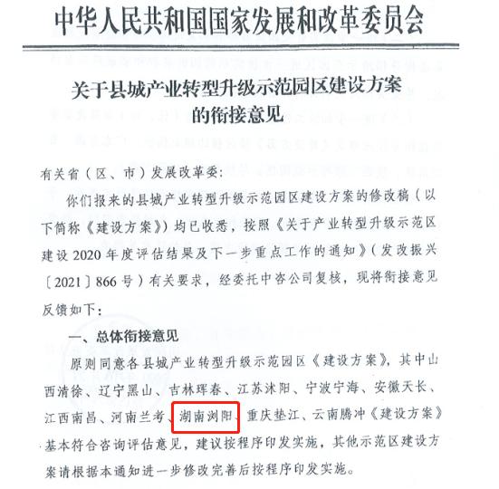 根據(jù)《國家發(fā)展改革委 科學(xué)技術(shù)部 工業(yè)和信息化部 自然資源部關(guān)于產(chǎn)業(yè)轉(zhuǎn)型升級(jí)示范區(qū)建設(shè)2020年度評(píng)估結(jié)果及下一步重點(diǎn)工作的通知》(發(fā)改振興〔2021〕866號(hào)),瀏陽經(jīng)開區(qū)成功入選國家級(jí)縣城產(chǎn)業(yè)轉(zhuǎn)型升級(jí)示范園區(qū)?!斗桨浮繁皇“l(fā)展改革委、省科技廳、省工信廳和省自然資源廳聯(lián)合印發(fā)。