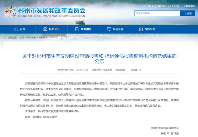 2022年12月9日,省咨詢公司憑借在生態(tài)文明領(lǐng)域的杰出業(yè)績(jī)和豐富的課題研究經(jīng)驗(yàn),聯(lián)合中國(guó)國(guó)際工程咨詢有限公司成功中標(biāo)郴州市生態(tài)文明建設(shè)總體研究方案和評(píng)估方案。