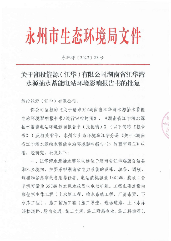 近日,我司環(huán)境保護咨詢事業(yè)部負責撰寫的《湖南省江華灣水源抽水蓄能電站環(huán)境影響報告書》,順利通過了永州市生態(tài)環(huán)境局的評審并取得批復(fù)(永環(huán)評〔2023〕23號)。