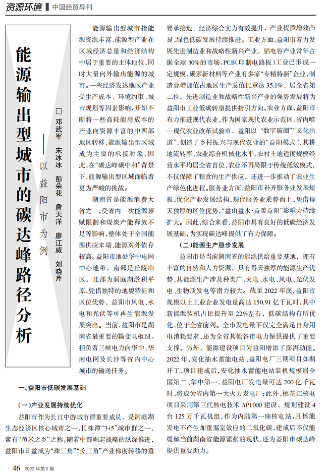 近日,由我司撰寫的《能源輸出型城市的碳達峰路徑分析—以益陽市為例》一文刊發(fā)于《中國經(jīng)貿(mào)導(dǎo)刊》2023年第6期,作者為我司生態(tài)規(guī)劃咨詢事業(yè)部鄧武軍、彭朵花、詹天洋、廖江威。
