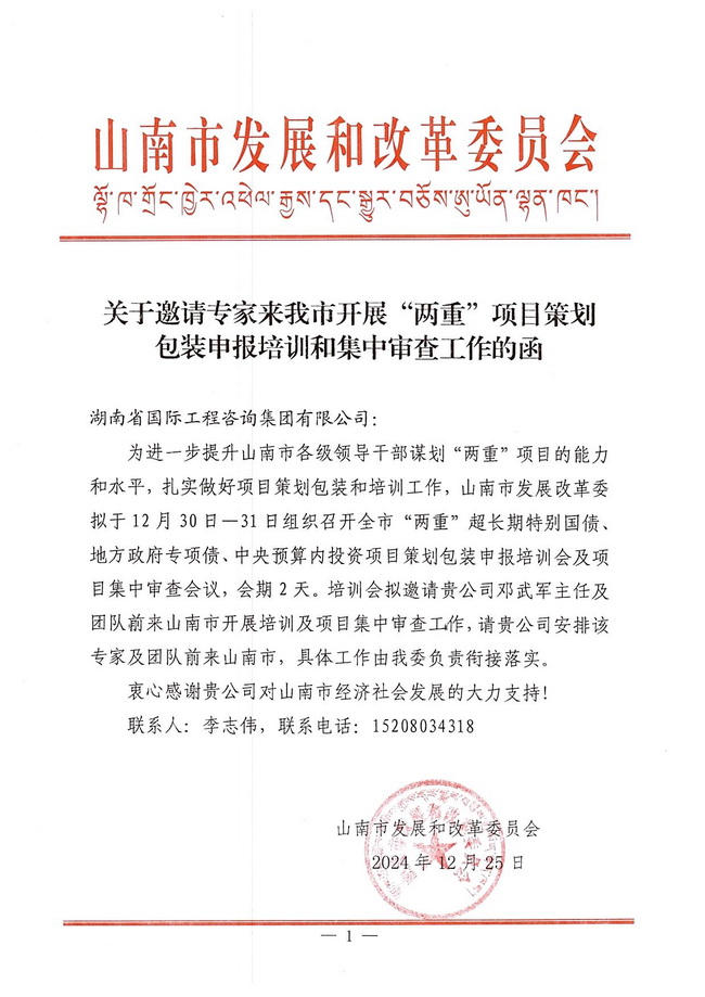 為進一步貫徹落實黨中央和上級組織對超長期特別國債、中央預(yù)算內(nèi)資金及政府專項債的有關(guān)部署要求,提升山南市各縣市區(qū)項目建設(shè)水平,應(yīng)山南市發(fā)展和改革委邀請,湘咨集團生態(tài)規(guī)劃咨詢事業(yè)部總經(jīng)理、正高級工程師鄧武軍等受邀赴山南市,對山南市“兩重”超長期國債、地方政府專項債和中央預(yù)算內(nèi)投資項目策劃包裝進行了專題集中培訓(xùn)指導(dǎo)與項目審查。