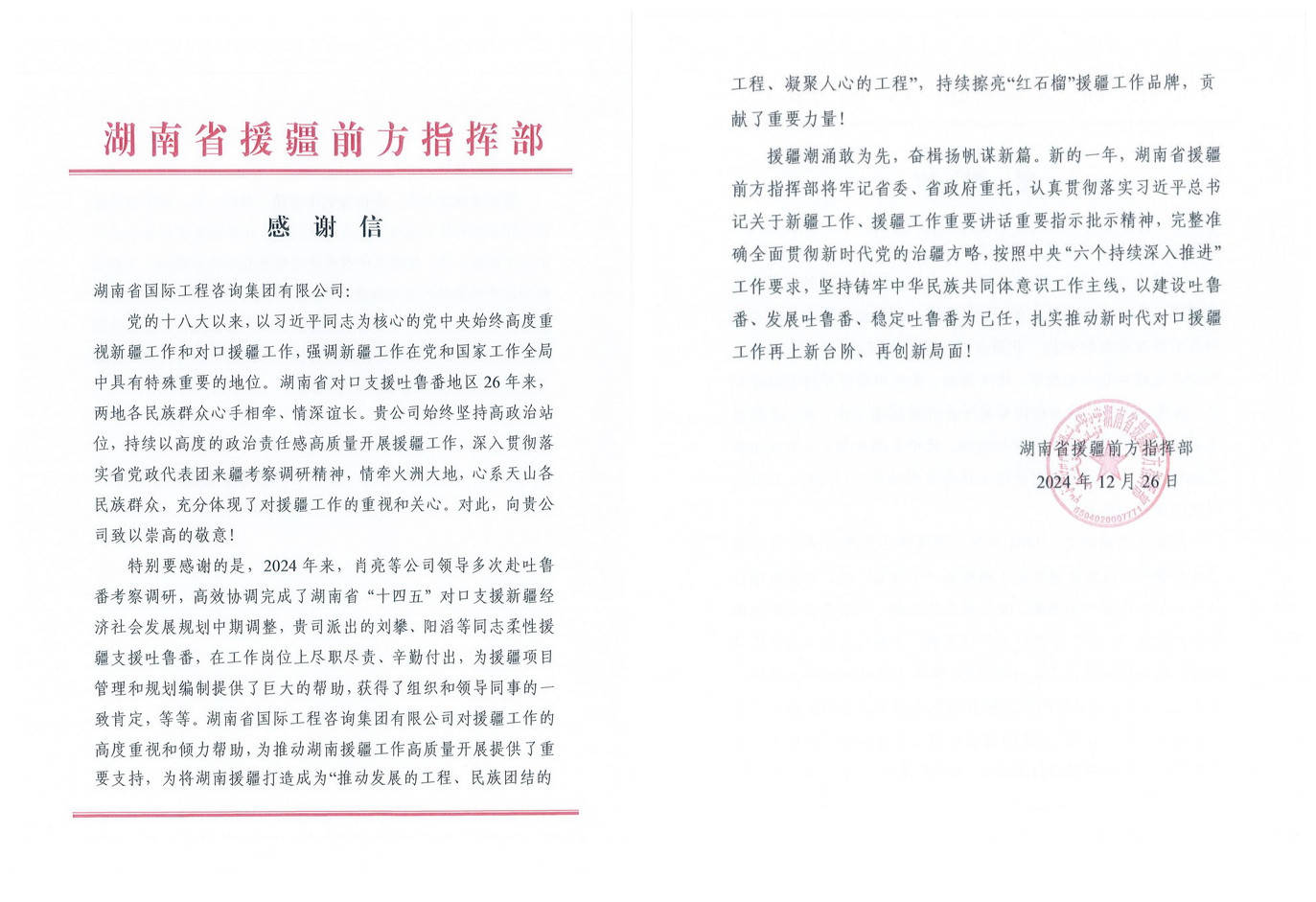 近日,湖南省援疆前方指揮部發(fā)來感謝信,對湘咨集團(tuán)及副總經(jīng)理肖亮、工作人員劉攀、陽滔等同志在援疆工作中作出的貢獻(xiàn)表示感謝。