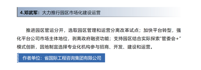 《大力推行園區(qū)市場化建設(shè)運營金點子》中建議,推進(jìn)園區(qū)管運分開,選取園區(qū)管理和運營分離改革試點;加快平臺轉(zhuǎn)型,強化平臺公司市場主體地位,剝離政府融資功能;支持園區(qū)結(jié)合實際探索“管委會+”模式創(chuàng)新,因地制宜選擇專業(yè)化機構(gòu)參與招商、開發(fā)、建設(shè)和運營。